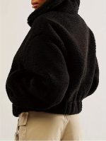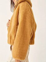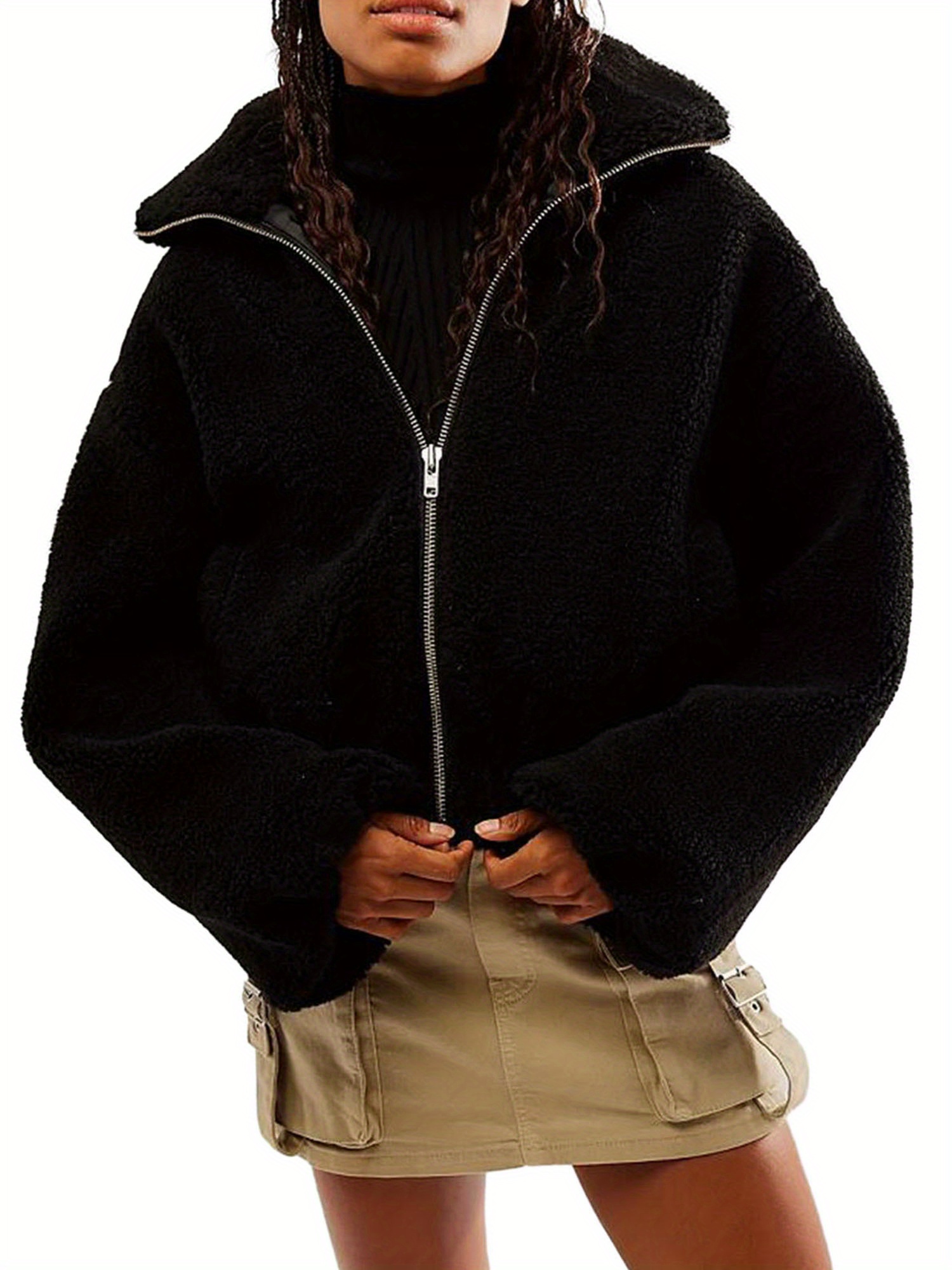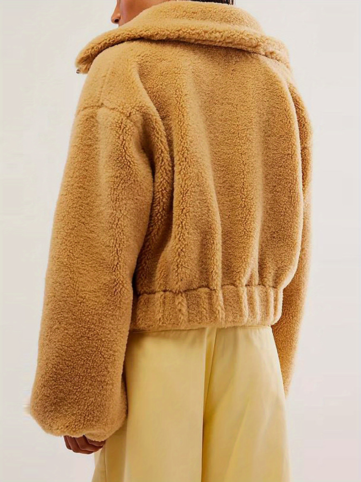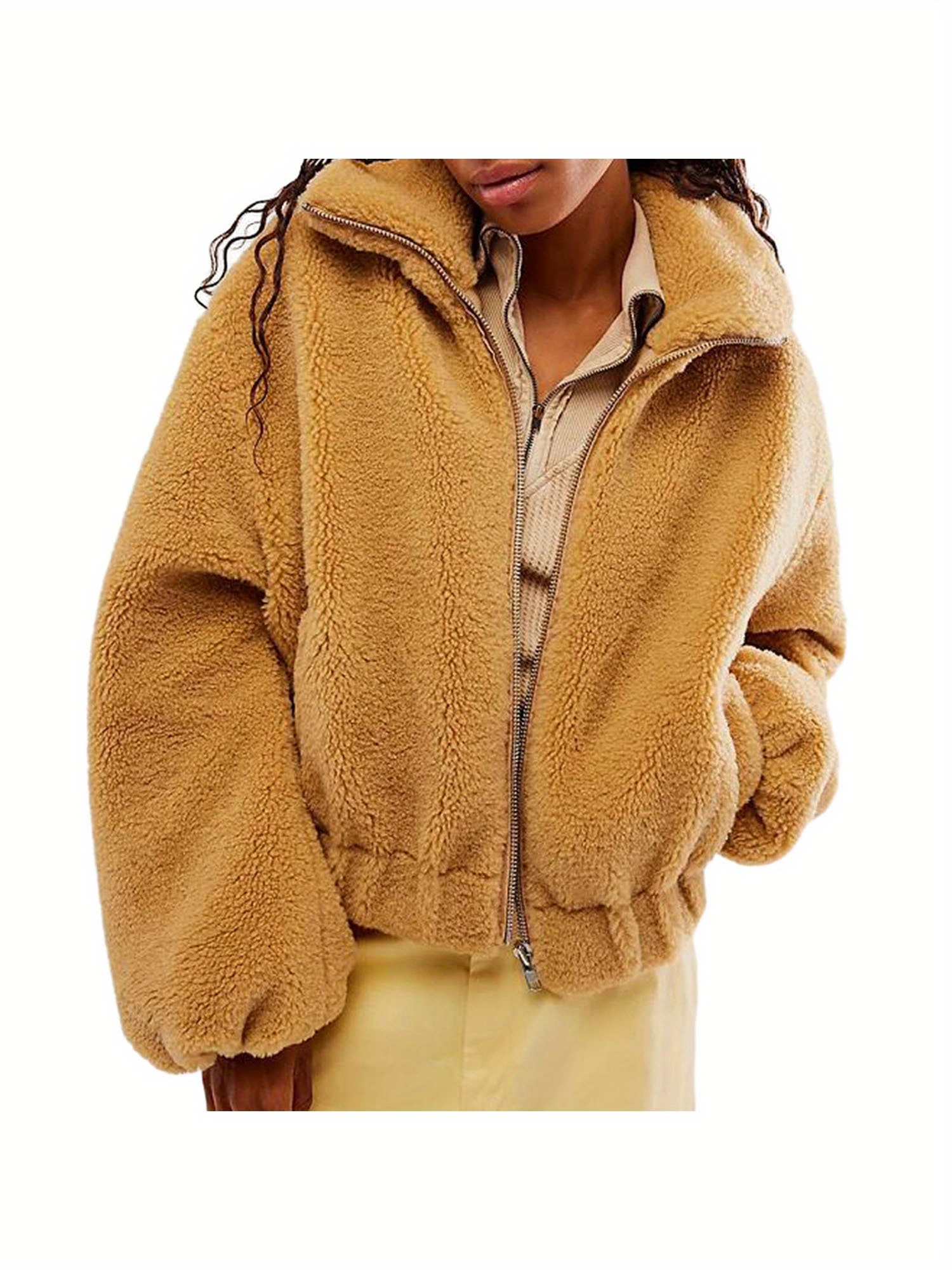 Women Winter Coat, Solid Color Zipper Up Folded Collar Jacket, Long Sleeve Warm Fluffy Fleece Spring Outfit