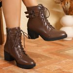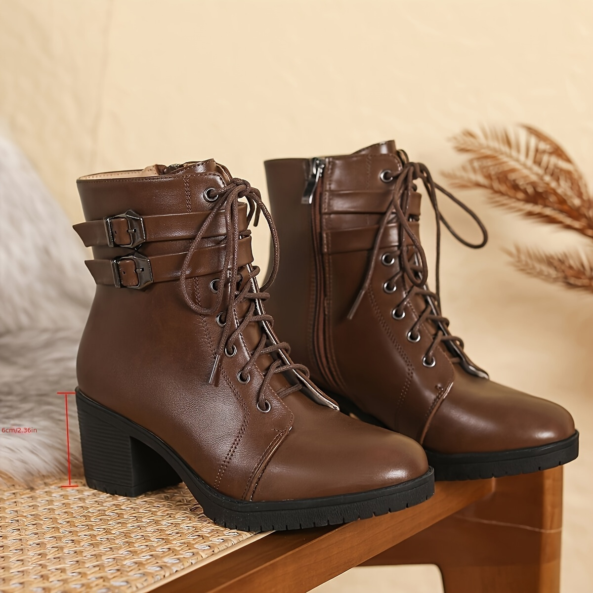 Women’s Elegant Brown Faux Cover Boots with Chunky Heel, Lace-Up & Side Zipper, Round Toe, High Heel, All-Season Casual Wear