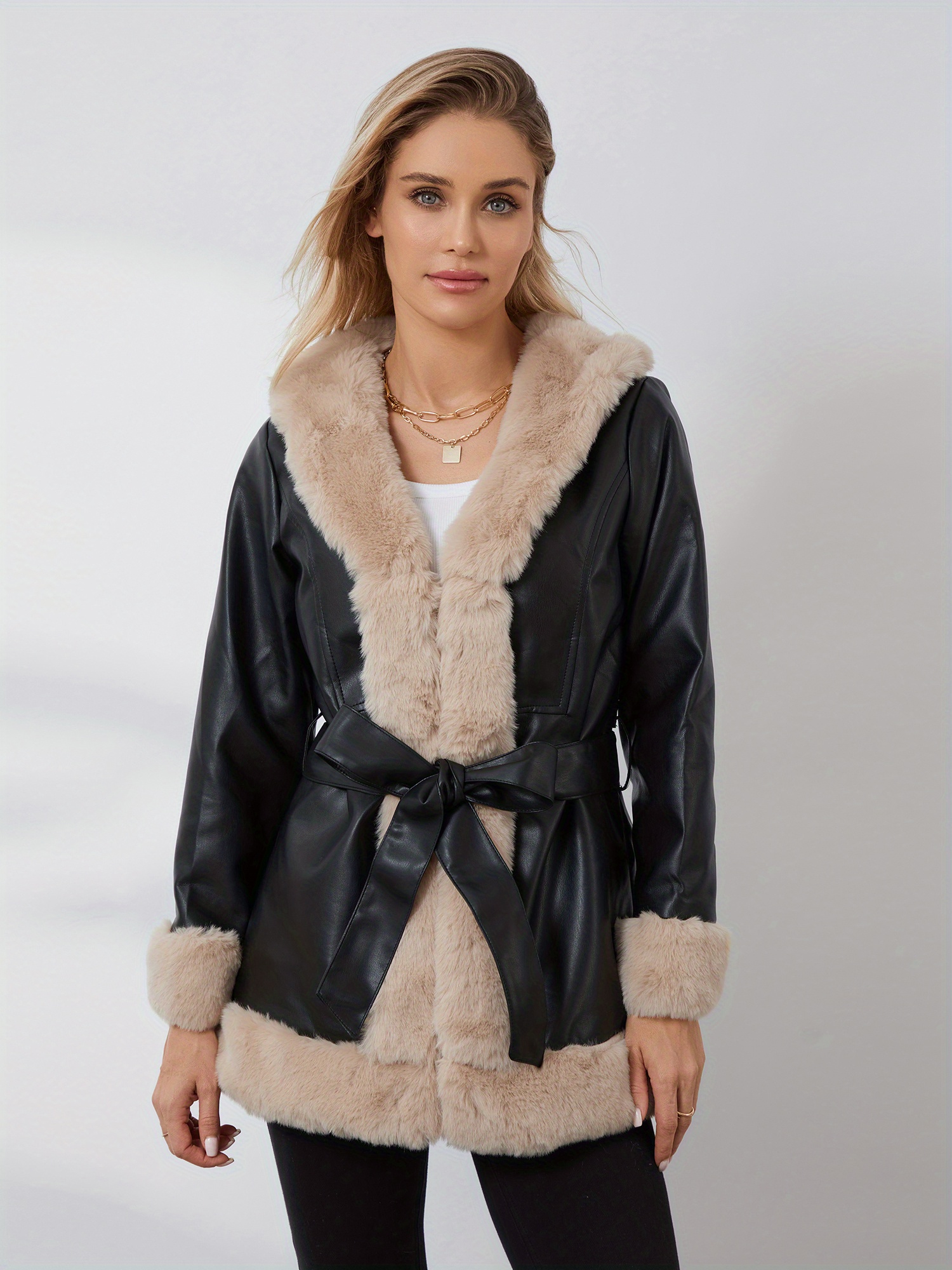 Women’S Elegant Jacket with Plush Collar and Belt – Solid Color, Open Front, Warm Cardigan for Fallu002FWinter, Streetwear Style, Streetwear Jacket | Contrast Color Jacket | Functional Cardiga