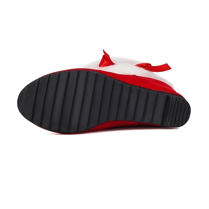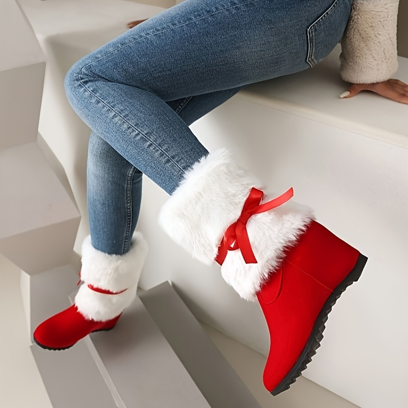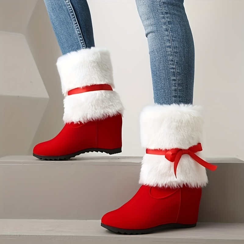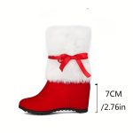 Home Women's Mid Calf Boots Women’S Elegant Red faux fur-Trimmed High-Heel Ankle Boots with Bow Detail – Cozy Winter Warmth, Round Toe & Thick Rubber Sole, Slip-On Closure for Parties, Weddings, And Casual Outfits, High Heel Boots, Sophisticated Style, Durable Traction Footwea