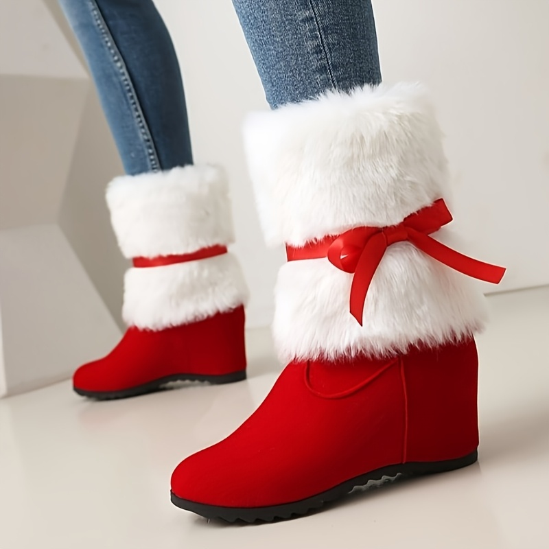 Women’S Elegant Red faux fur-Trimmed High-Heel Ankle Boots with Bow Detail – Cozy Winter Warmth, Round Toe & Thick Rubber Sole, Slip-On Closure for Parties, Weddings, And Casual Outfits, High Heel Boots, Sophisticated Style, Durable Traction Footwea