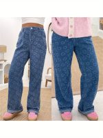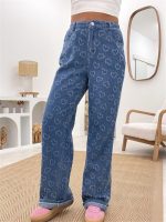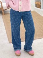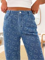 Home Women's Pants Women’s High-Rise Straight Leg Jeans – Blue Denim Pants with Heart Pattern, Multiple Pockets & Semi-Sheer Design | Machine Washable Casual Comfort for All-Season Wear