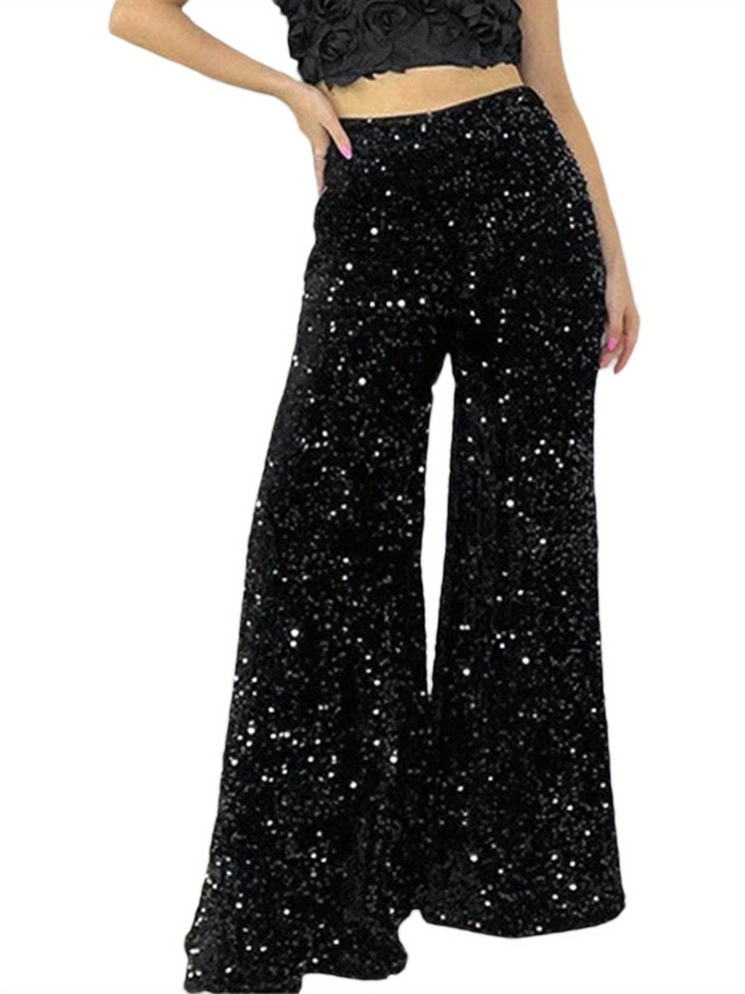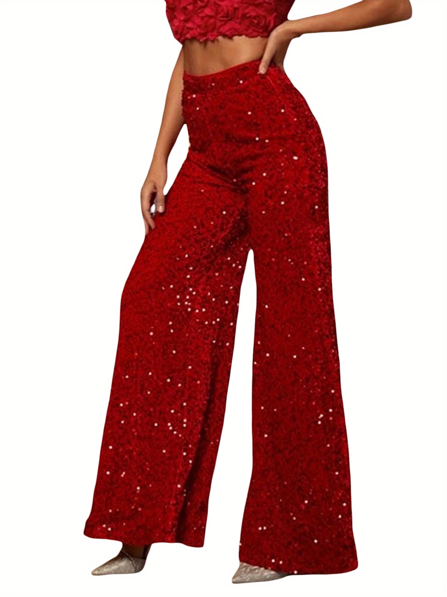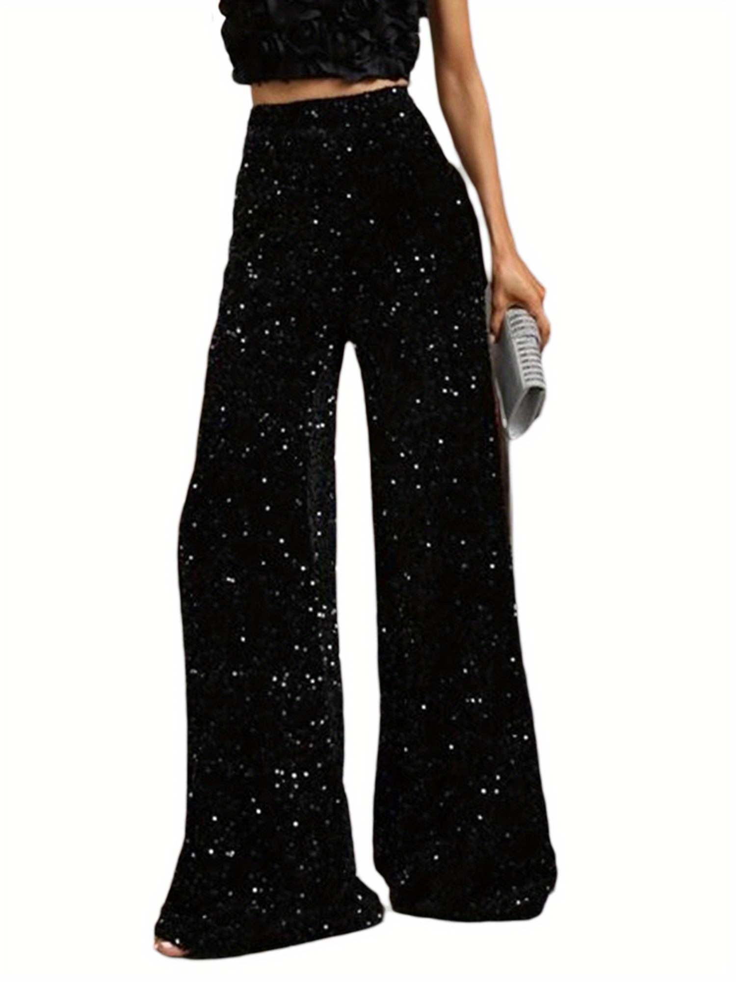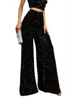 Women’s Shiny Sequin Wide Leg Pants with Elastic High Waist – Sparkling Loose Fit Trousers for Work, Office, Party & Streetwear | Winter Dress Pants (Casualu002FShiny, No Stretch)