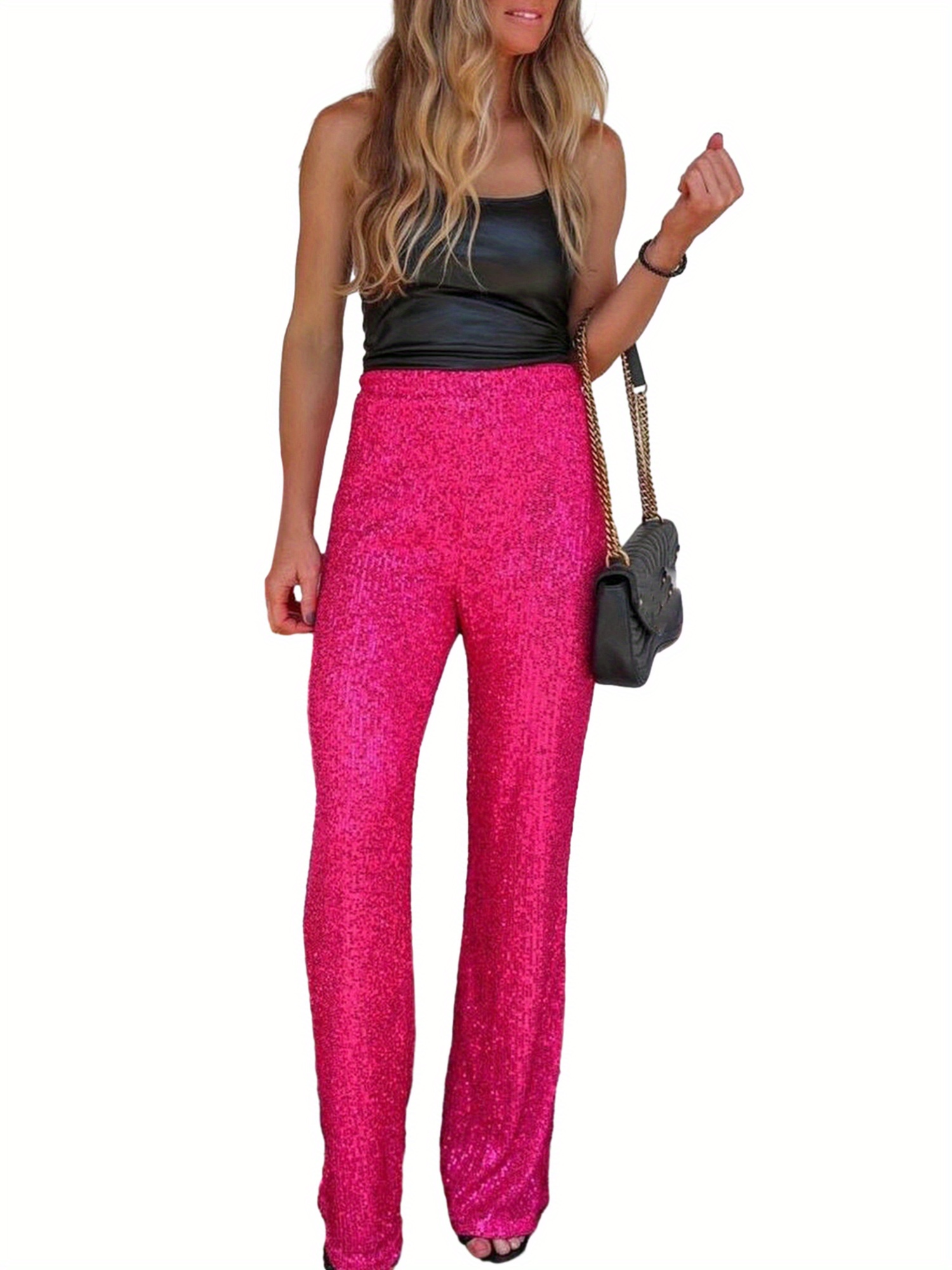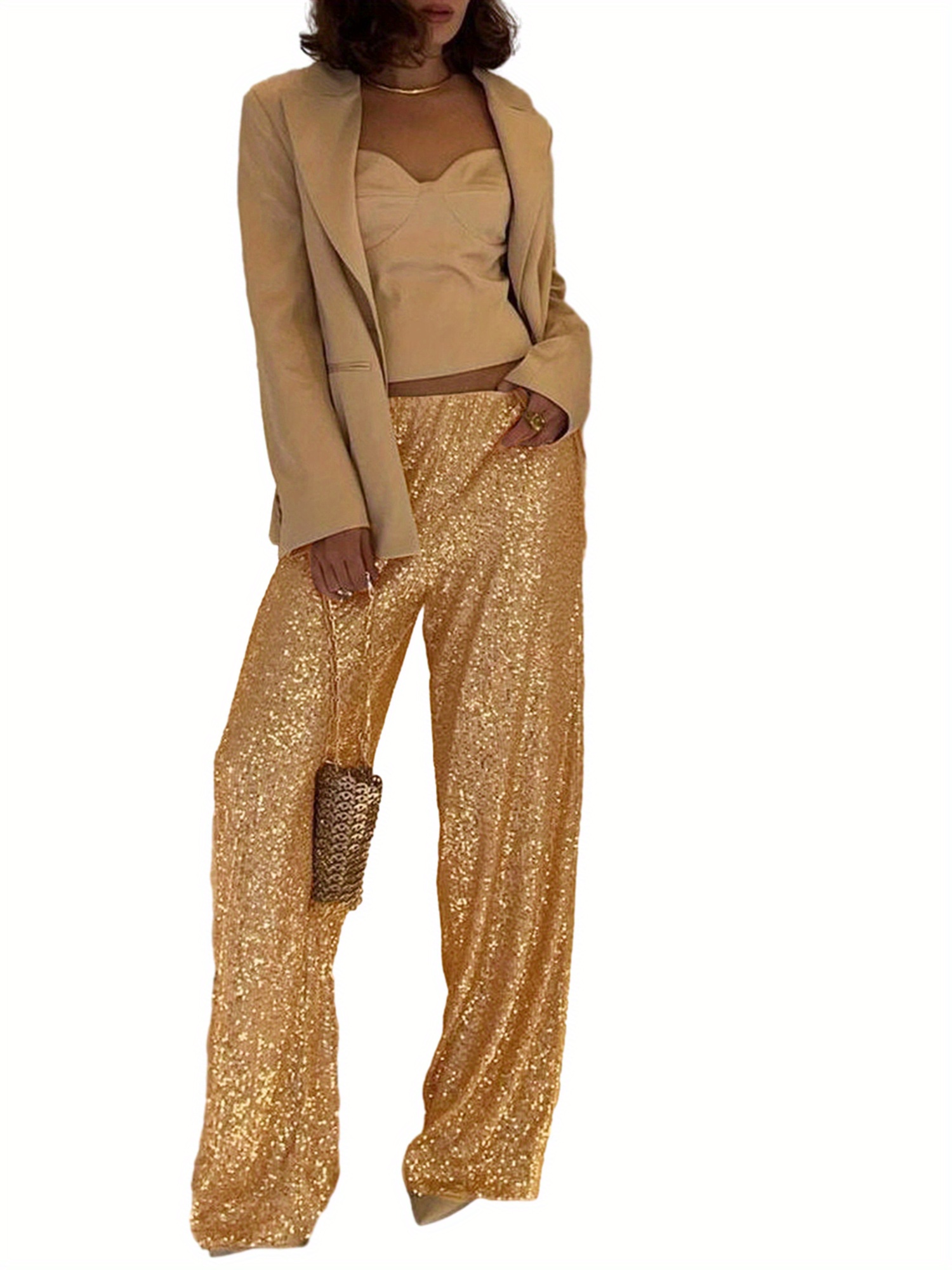 Home Women's Pants Women’s Shiny Sequin Wide Leg Pants with Elastic High Waist – Sparkling Loose Fit Trousers for Work, Office, Party & Streetwear | Winter Dress Pants (Casualu002FShiny, No Stretch)
