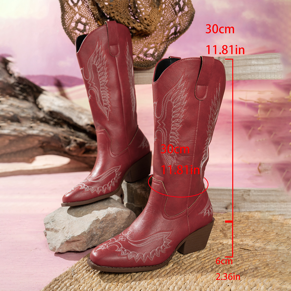 Women’S Western Style Mid Leg Boots | Exquisite Embroidered Upper with High-quality Stitching, One-foot Pointed Toe with Thick Heel, Pure Handmade Fabric Insoles, Suitable for Daily Wear and Travel Parties
