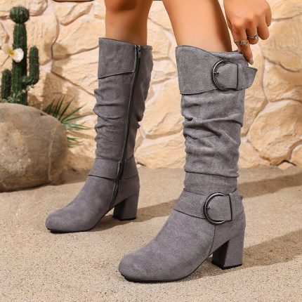 European And American Style Round-Toe High-Heeled Mid-Calf Boots for Women, New Evening Wear for Parties, Sexy Party Dress Paired with Women'S Mid-Calf Boots.